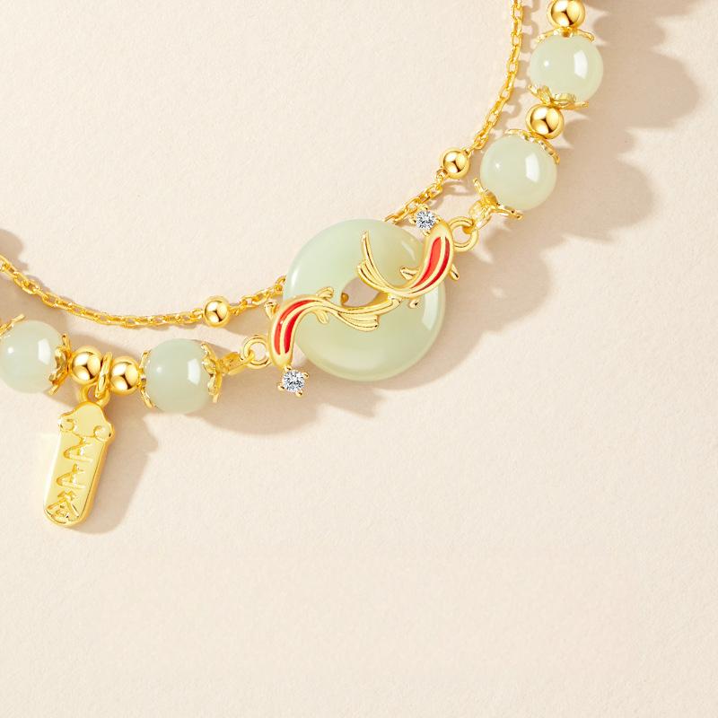 Hetian jade—revered for over 7,000 years in Chinese culture—is prized not only for its creamy texture and subtle glow but also for its profound metaphysical properties: it is believed to calm the mind, attract benevolent Qi, and offer lifelong protection to its wearer. Paired with the Peace Button (symbolizing safety, wholeness, and smooth life flow) and the koi (emblem of perseverance, transformation, and abundance), this bracelet becomes a wearable blessing for modern life.