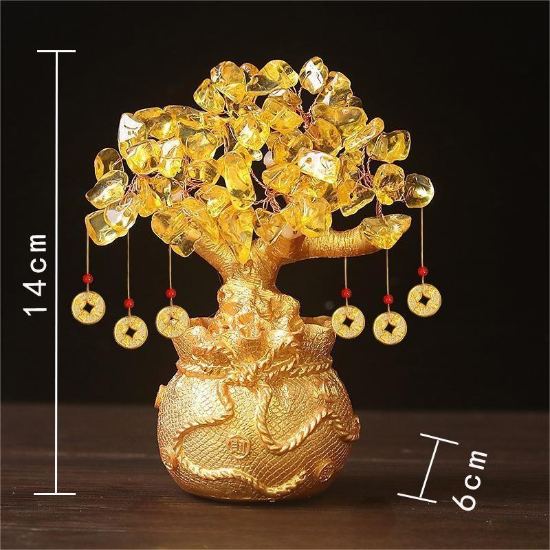 Each tree features vibrant, genuine citrine crystals, symbolizing sunlight and riches, paired with traditional Chinese metal coins and intricate “money bag” ornaments. It represents the vigorous growth of your fortune. The stable wooden base and elegant pot signify grounding and accumulated wealth.