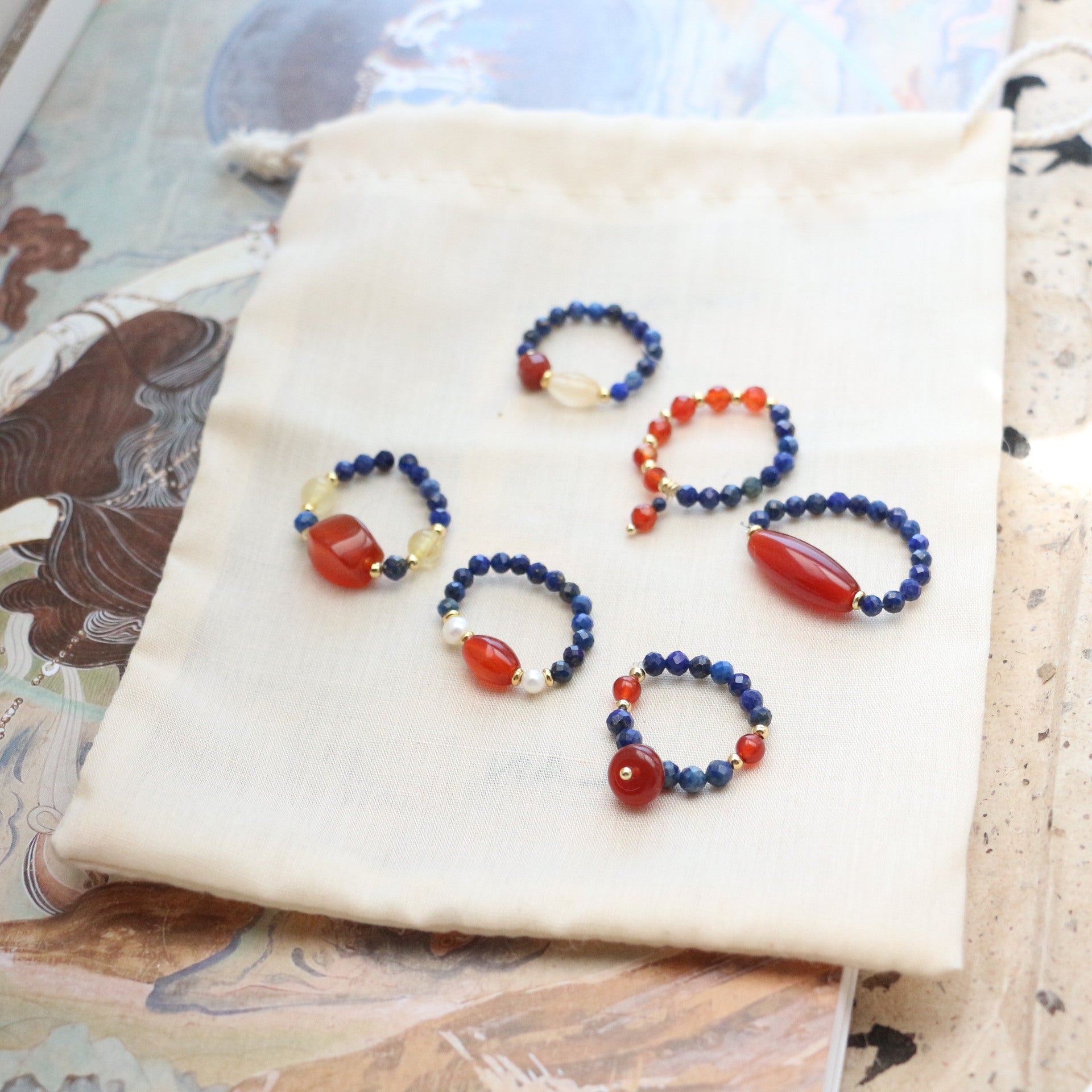 Découvrez le parfait mélange d'élégance spirituelle et d'artisanat ancien avec notre ensemble de bagues en Lapis Lazuli et Agate Rouge style Dunhuang.